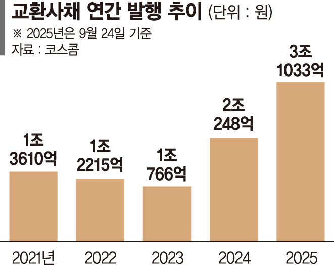 25일 코스콤 체크에 따르면 지난 24일 기준 올해 교환사채 발행액은 3조1033억원으로 집계됐다. 이미 지난해 연간 발행 규모(2조248억원)를 뛰어넘었다. 지난 2023년 연간 발행액 1조766억원과 비교하면 2년새 3배 가까이 늘어난 규모다.